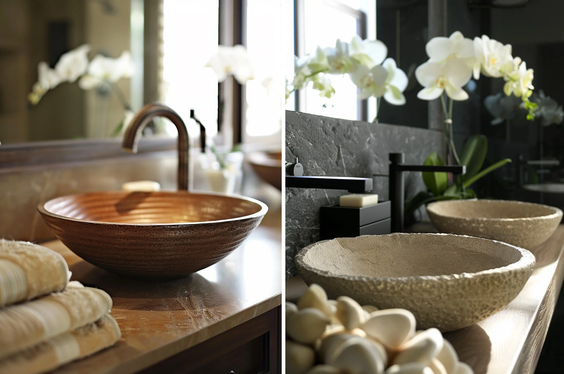 Натуральные материалы, такие как камень или дерево, используются для создания накладных раковин, идеально дополняя интерьеры в эко-стиле. Эти материалы добавляют теплоту и природную гармонию в пространство.